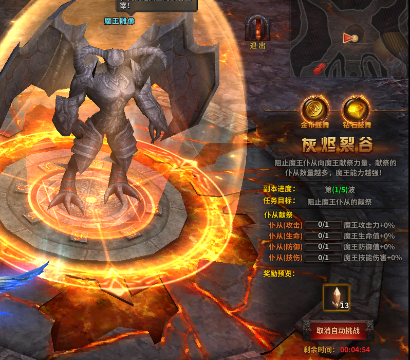 副本玩法:灰烬裂谷中,玩家会出现在魔王雕像身边,四周会刷新怪物,你需要在魔王仆从到达雕像之前把他们全部杀掉,阻止魔王的仆从献祭,没有及时杀死仆从会导致雕像状态的魔王属性增加,一旦复活后难以快速击杀。所以这个副本的玩法核心就是速杀不漏怪。副本奖励也是根据你通关副本的速度决定的,速度越快奖励越高,反之速度越慢奖励越低。