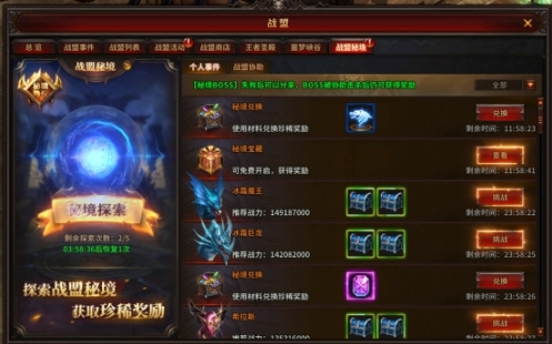 在战盟秘境里面,秘境宝藏是可以直接点击领取获得奖励的,秘境兑换则需要你有相应的材料才能兑换相应的道具,而秘境BOSS就需要玩家击杀BOSS才能领取奖励了,BOSS战力各有不同,打不过也没关系,失败后可以点击分享,分享到战盟协助列表里面,找大腿们帮忙打过,别人帮忙击杀的BOSS,双方都能拿到奖励。