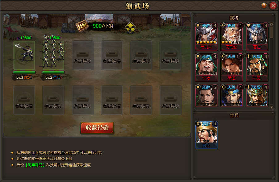 在演武场中可以训练武将和士兵,在训练的单位可以持续获得经验