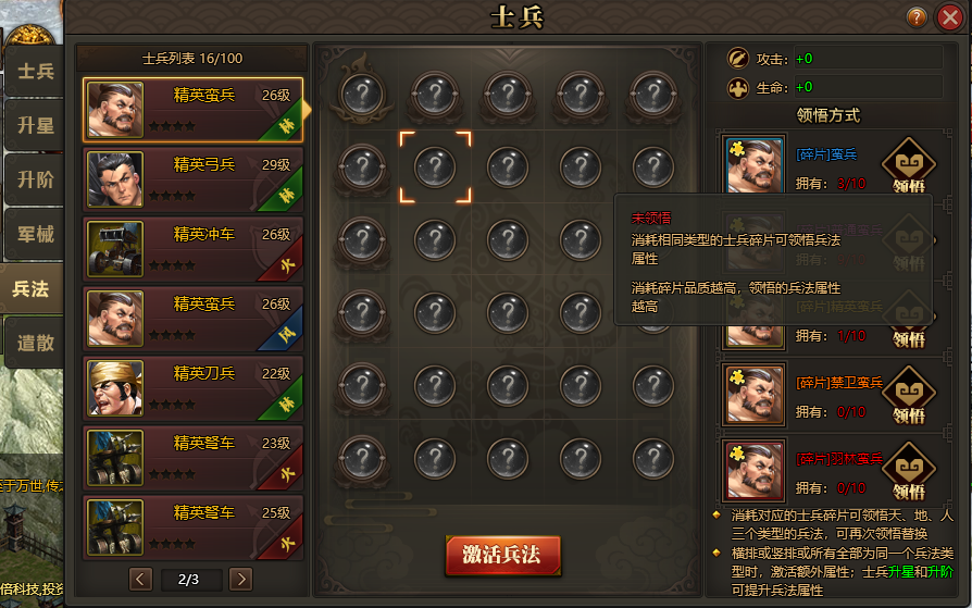士兵可以领悟天、地、人三个类型的兵法,对不满意的兵法可以重复领悟。横排或竖排或所有全部30个点阵均为同一个兵法类型时,可以激活额外属性,除此之外士兵升星和升阶也可提升兵法属性。
