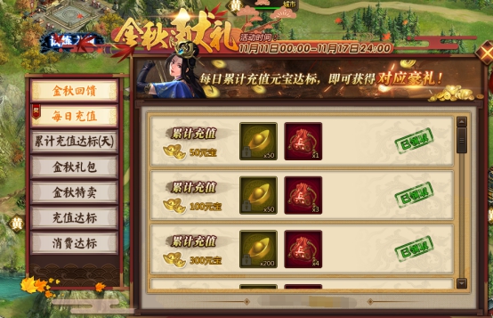 l 当日充值满500元宝,可额外领取一次已选奖励。
