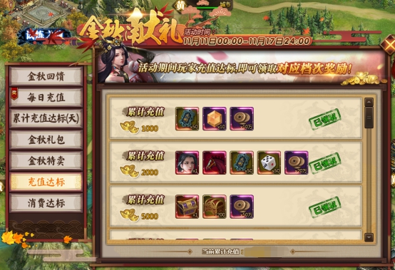 l 活动期间,充值达标即可领取对应奖励。具体对应档次奖励情况: