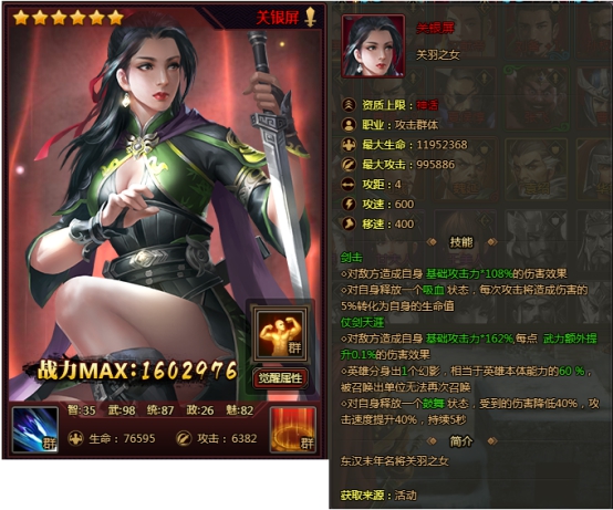 l 新增攻击神话武将—关银屏,详情如下:
