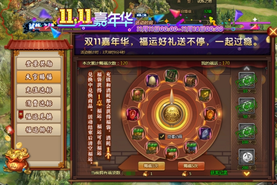 l 活动期间累积福运进行排行,可获得专属称号及丰富道具奖励福运越多,排名越高,截止11月18日0:00后可领取奖励;
