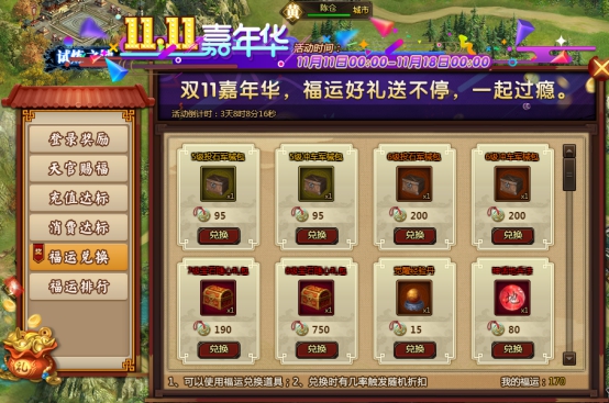 l 活动期间,可使用福运进行道具兑换,兑换时有几率触发随机折扣;