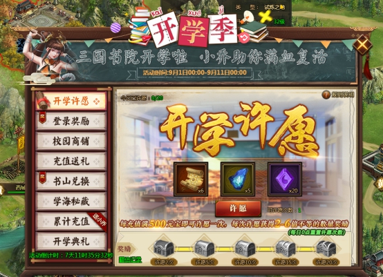 l 当日每充值满500元宝,可额外领取一次奖励,许愿可获2-6倍不等的奖励;