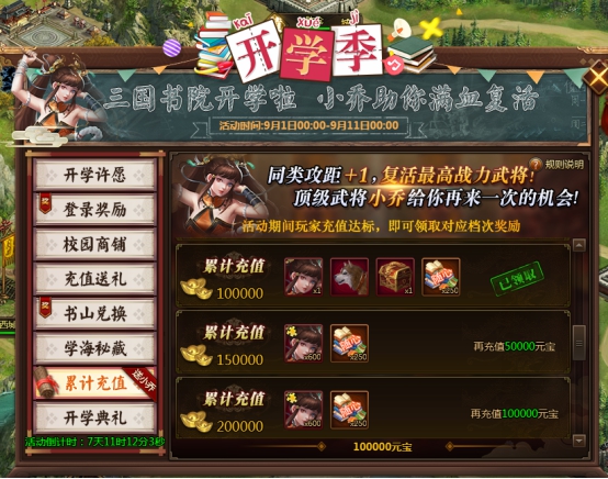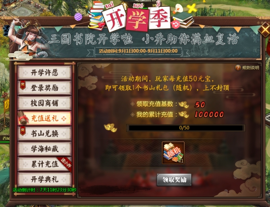 l 活动期间每充值50元宝,即可领取一个书山礼包(随机),上不封顶。书山礼包(随机):随机开出开(概率25%)、学(概率25%)、那(概率25%)、点(概率17%)、事(概率8%)其中1字。