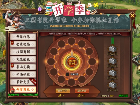l 活动期间,消耗50元宝可抽奖一次,消耗500元宝可抽奖十次,抽奖次数累积到一定数量可以领取额外奖励;