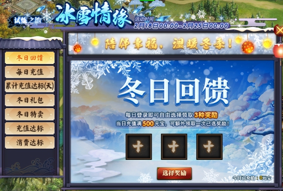 l 当日充值满500元宝,可额外领取一次已选奖励。
