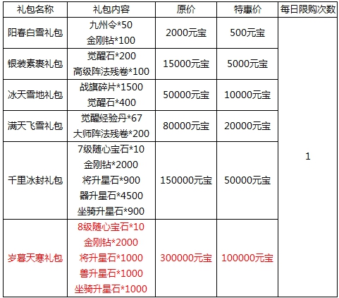 l 活动期间可购买超值优惠大礼包,具体对应礼包内容情况: