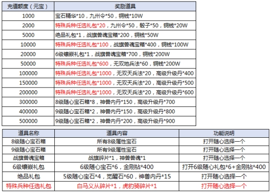 l 活动期间,充值达标即可领取对应奖励。具体对应档次奖励情况: