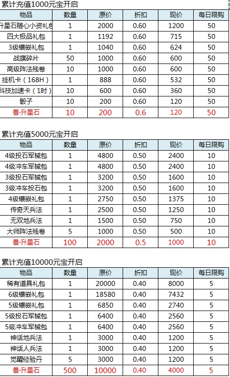 l 每日累计充值达到指定元宝可开启对应商店,充值金额越高,折扣越低;