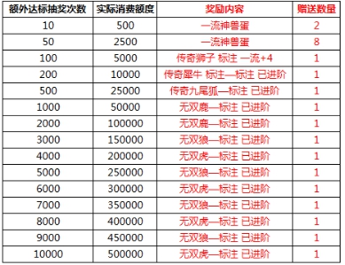 l 活动期间,消耗50元宝可抽奖一次,消耗500元宝可抽奖十次,抽奖次数累积到一定数量可以领取额外奖励;