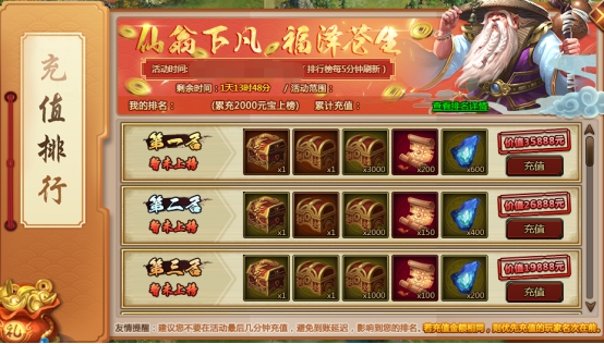 建议不要再最后几分钟充值,避免出现延迟影响排名,活动结束后,排行榜上玩家依据排名领取对应礼包。