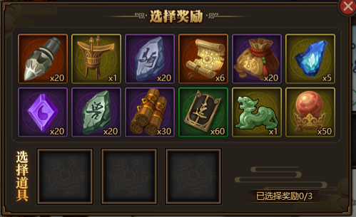 奖池分为一流、无双、神话3种 ,玩家每天可在3种奖池中选取分别选取5(一流)、4(无双)、3(神话)个道具来组成奖励转盘进行抽奖,每天仅一次自选次数,奖池情况如下: