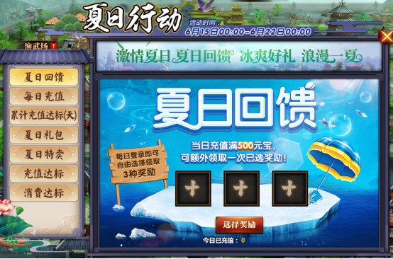 l 当日充值满500元宝,可额外领取一次已选奖励。