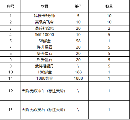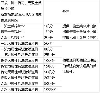l 活动期间,开放一流、传奇、无双士兵碎片兑换;新增指定激活天地人兵法属性道具兑换。