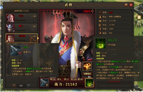 1、 新增特殊职业远程群体武将—汉献帝:克制攻击、防御类武将,顶级特殊远程武将,狂暴输出,极品控制;