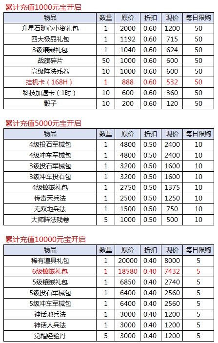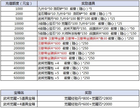 l 活动期间,充值达标即可领取对应奖励。具体对应档次奖励情况: