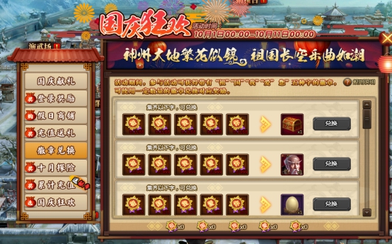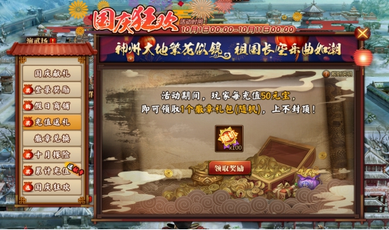 l 活动期间每充值50元宝,即可领取一个徽章礼包(随机),上不封顶。徽章礼包(随机):随机开出祖(概率25%)、国(概率25%)、我(概率25%)、爱(概率17%)、你(概率8%)其中1字。