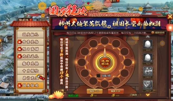 l 活动期间,消耗50元宝可抽奖一次,消耗500元宝可抽奖十次,抽奖次数累积到一定数量可以领取额外奖励;
