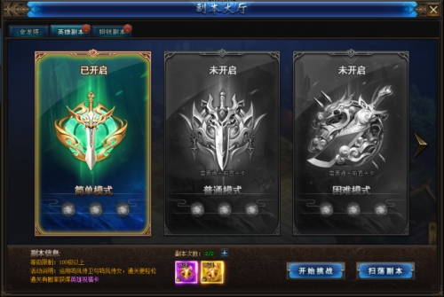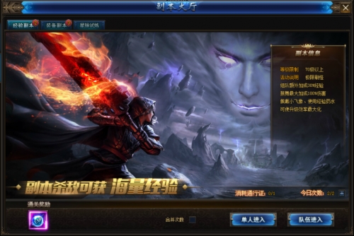 1.玩家达到72级开启经验副本,100级开启英雄副本,105级开启装备副本,190级开启铜钱副本,点击进入副本界面。副本界面分为单人副本和多人副本,可获得海量经验和各种装备。