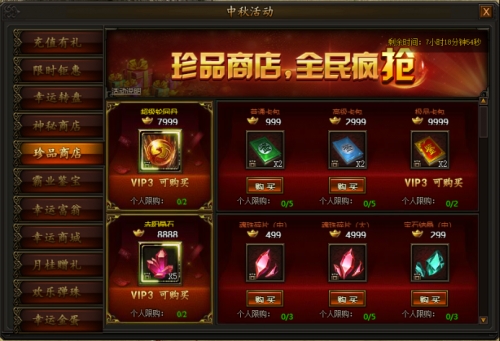 活动期间,每天会随机刷新一批特价道具,花费少量元宝即可购买,每个道具均有每天最大个人购买次数限制,部分道具有购买vip等级限制,买到就是赚到,机会不容错过!