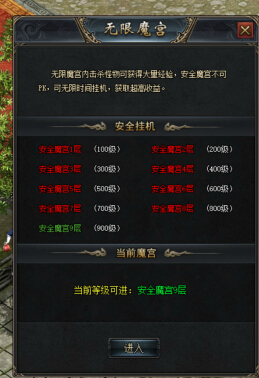 如上图:进入各个等级段的无限魔宫练功房,大量怪物无限时间,无限刷新,无限经验等你来拿