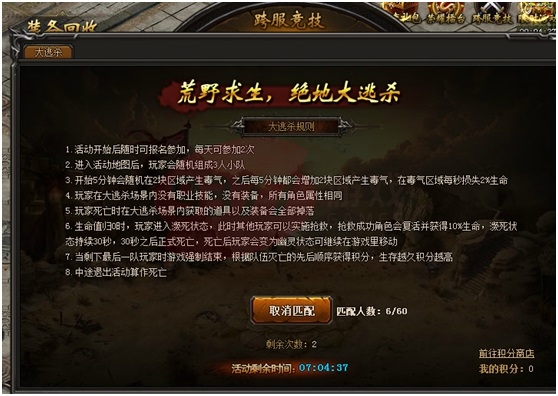 大逃杀是传奇荣耀跨服竞技的活动, 12:00-22:00是大逃杀的活动时间。荒野求生,惊心动魄的绝地大逃杀每天都会上演。