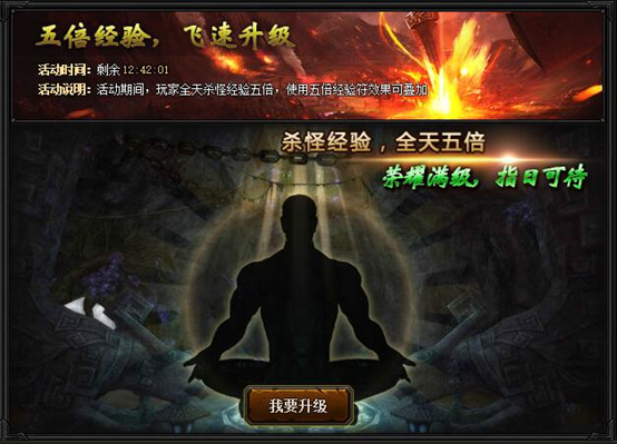 【活动内容】传奇荣耀荣耀庆典活动期间,全服双倍经验活动全天开启,所有玩家击杀怪物获得的经验翻倍,海量经验轻松获得!(使用多倍经验符效果可叠加)