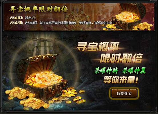 【活动内容】活动期间,城主宝藏寻宝概率限时翻倍,荣耀神骑、荣耀神翼、荣耀配饰等你来拿!