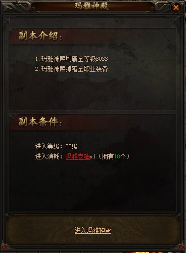 想要进入神殿必须要消耗玛雅卷轴,神殿内有全等级BOSS,掉落全职业所有装备。