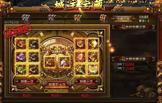 目前,在城主宝藏界面有“探索一次”、“探索十次”以及“探索五十次”的按钮。探索一次需要消耗藏宝图*1、探索十次需要消耗藏宝图*10、探索五十次需要消耗藏宝图*50。