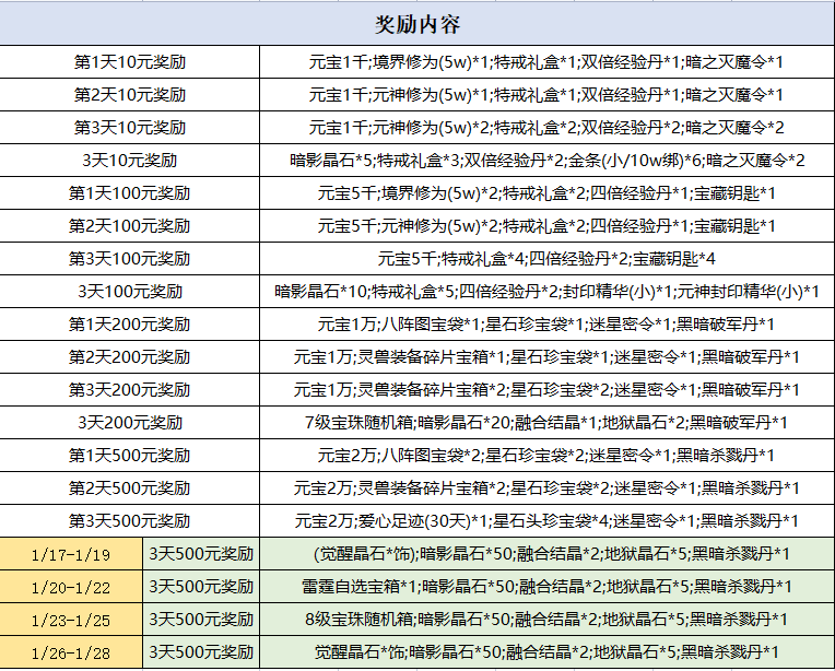 活动时间:1/17-1/19 1/20-1/22 1/23-1/25 1/26-1/28(3天一小周期)