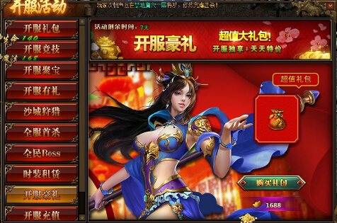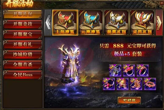 活动详情:活动期间玩家只需花费对应数量的元宝,即可获得极品精美套装。套装包含主角神装、光翼礼包、灵兽礼包、神器礼包。珍奇好礼,让您体验非一般的游戏感受!