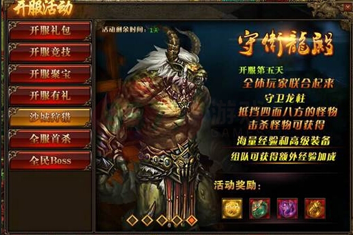 活动详情:全体玩家联合起来,守卫龙柱,抵挡四面八方的怪物,获得海量经验和高级装备,组队可获得额外经验加成