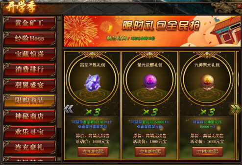 1.活动期间,玩家可在活动面板购买限购商品;(可翻页)