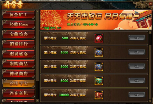 1.活动期间,玩家累计寻宝次数满足要求,可以领取本职业仙装、本职业星石、传世灵器·仙带等相应奖励;