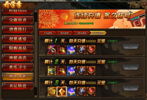 2.累积充值达到三天,奖励翻倍领,更可领取稀有称号(称号可淬炼)!