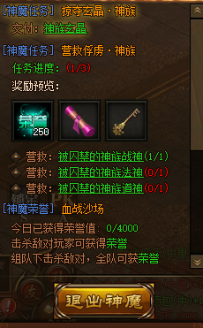 完成神魔任务可以获得荣誉点,荣誉点可以在新开的神魔商店中买东西。每天获得的荣誉点也是有上限的,这对应着不同的特权。获得荣誉点还可以通过王座争夺战,神魔任务,杀死神魔boss和杀死对面阵营的人等。