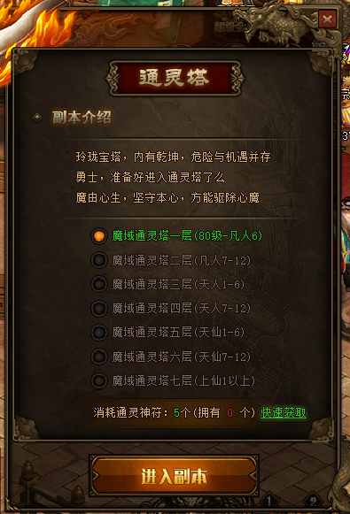 【神魔BOSS】就是在通灵塔找到自己相应境界的BOSS前去挑战,里面可以爆出白银箱子、钥匙之类的特殊物品。进入相应的地图需要5个通灵神符,神符可以通过商铺用绑金购买,也可以去神域边塞打骑将和统领怪爆出。