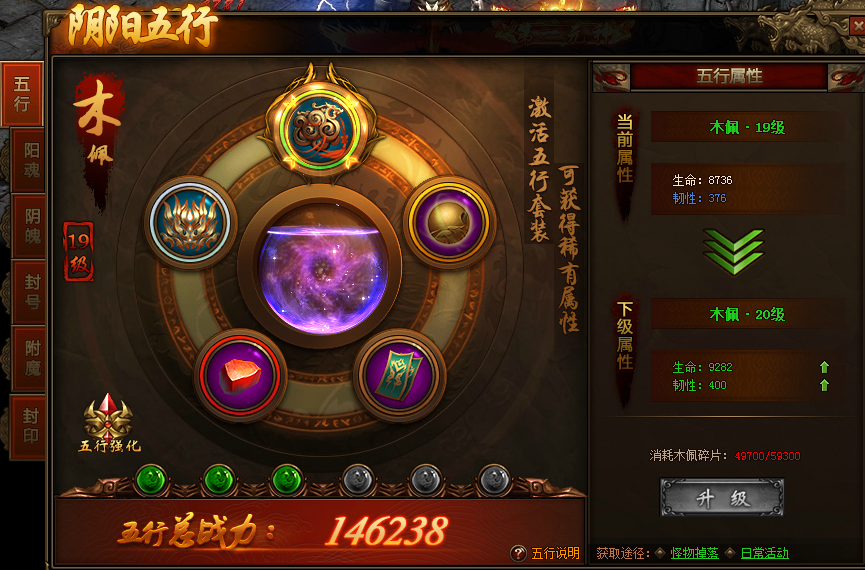 五行系统是非常有特色的一个系统,我们在日常的活动中,收集五种不同属性的道具,在集齐之后就可以激活五行套装,能够获得非常稀有的装备,无论是对我们角色本身,还是元神都有着很大的提升。五行装备的获取途径主要是材料副本、图鉴商人、藏宝图,这里面材料副本我们能够得到的主要是火属性的道具,想要得到其他属性的装备还是需要去图鉴商人那里兑换。