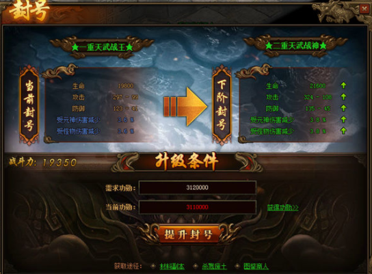 封号系统每升一级,除了可以提升角色的防御能力之外,还能提升相应的减伤加成。封号等级越高,角色的防御越强,在pk刷怪中也可以游刃有余。提升等级的功勋值可以通过材料任务、杀戮废土、图鉴商人获得。