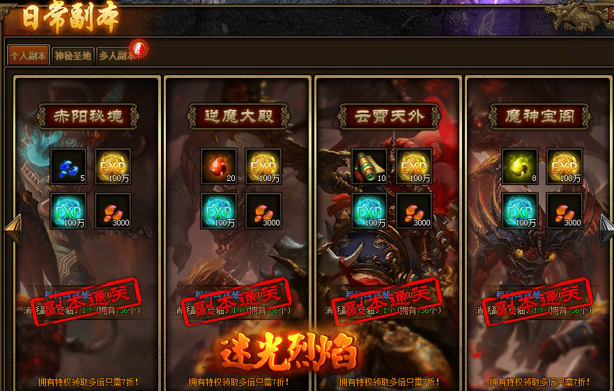个人副本的经验不多,但是材料给的非常多,在游戏中玩家需要的羽翼、元神、封号、五行、噬魂等所需要进阶的材料都可以在个人副本中获得。如果你是土豪玩家可以不用在意,非土豪玩家一定要看,羽翼进阶需要羽毛,在商城里面1根羽毛25元宝,花费5w元宝才只能把羽翼升到5阶,亲身实测,所以所非土豪少年个人副本是每天都要打的!