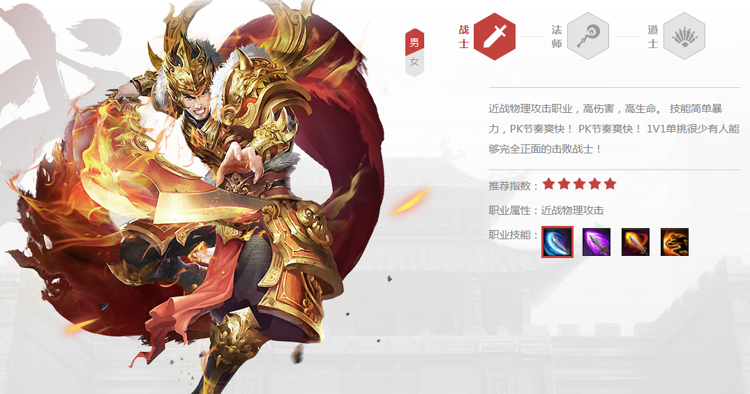 但是战士的弱点也是很明显的,战士在前中期没有好的装备的情况下对战同等装备其它职业的时候是没有还手之力的。战士的防御和攻击在前期刷怪是足够了,但是面对法师道士前期的高爆发,在还没冲到人家脸前的时候就被打成空血了,而且攻击也并不能直接秒杀对面。所以战士想要玩得好,要做好前期低调的准备,等到后期再爆发,或者如果肯大量投资的话,战士也是最佳的选择,事实上《传奇世界网页版》中很多土豪玩家,玩的正是战士。