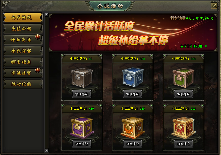 活动说明:活动期间内,累计活跃度达到指定需求,即可领取对应活跃度宝箱