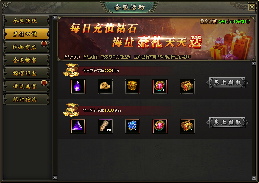活动说明:活动期间,每日充值达到指定额度,即可领取超值豪礼,每种档位可领取一次
