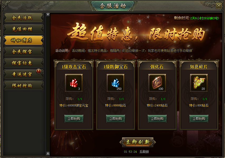 活动说明:活动期间,推出特价商品,每隔两小时自动刷新一次,玩家可使用钻石进行手动刷新
