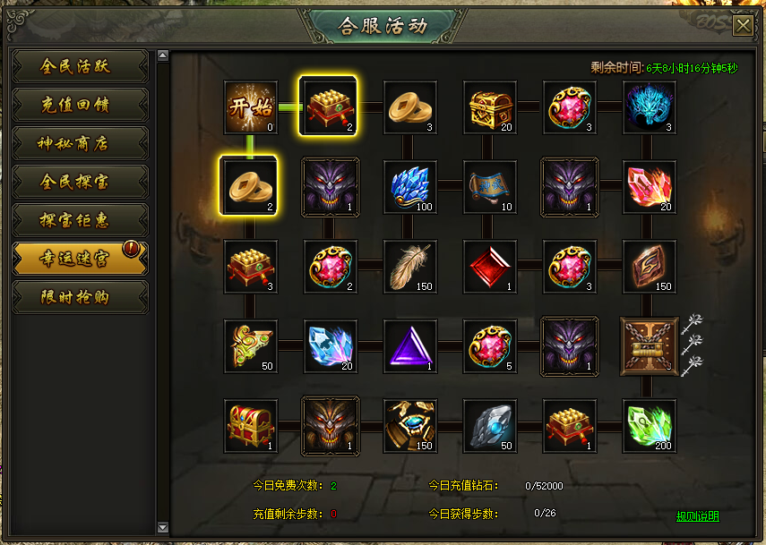活动说明:活动期间内每天赠送2次移动次数,不同选择方式获得不同槽位奖励,神奇迷宫百变奖励等您来拿(奖励每日重置、每日从零开始)