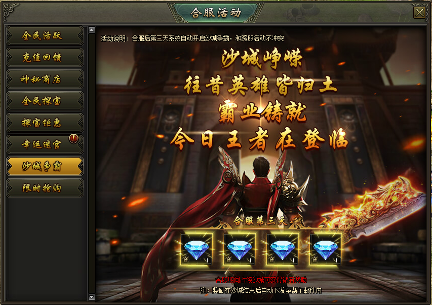 活动说明:合服第三天系统自动开启沙城争霸,活动期间占领沙城将获得大量钻石奖励!
